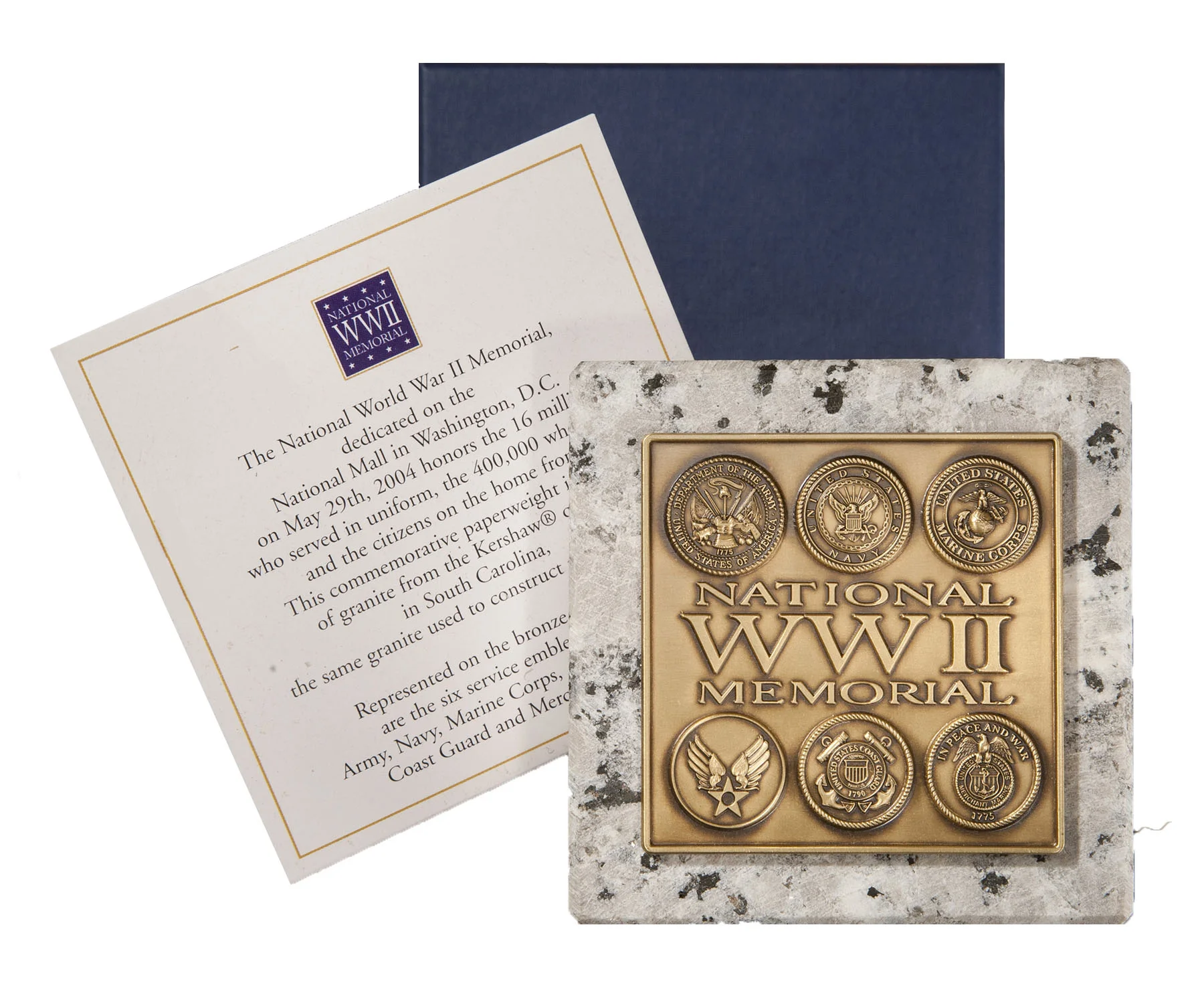 Our first Smithsonian project was in 2004 with their World War II Memorial Product Development Team to create new products for the dedication of the Memorial. These products included a bronze commemorative medallion, a paper weight made of the stone from the Memorial (shown here), prints that honored each military branch that fought in WWII, and an original rendering of the Memorial that was offset printed and sold as large color prints.